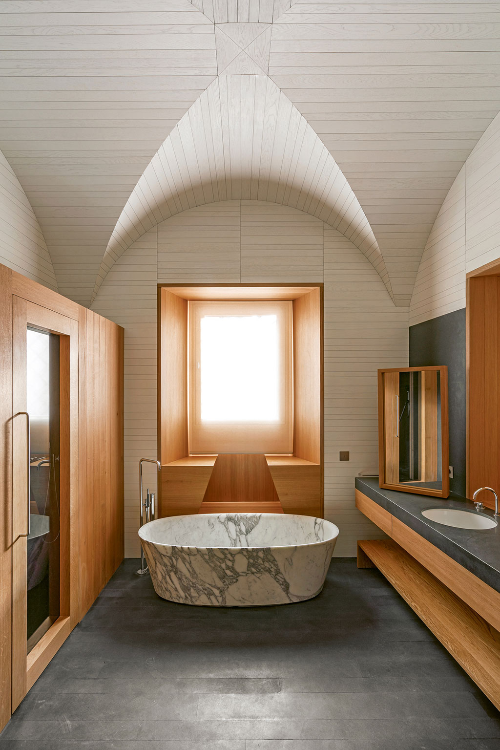 Todas cuentan con zona de trabajo y un amplísimo cuarto de baño, que separa sanitario y ducha doble en sendas cabinas insonorizadas de roble macizo, y presenta una gran bañera de mármol de una sola pieza.