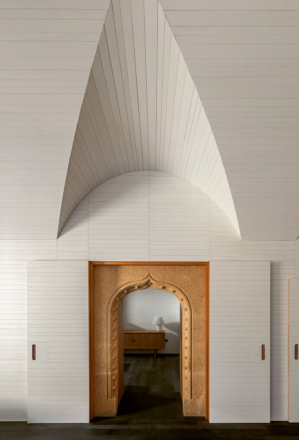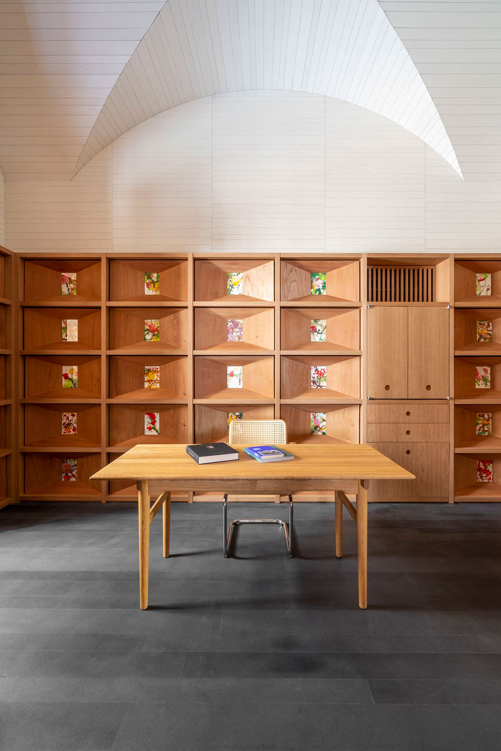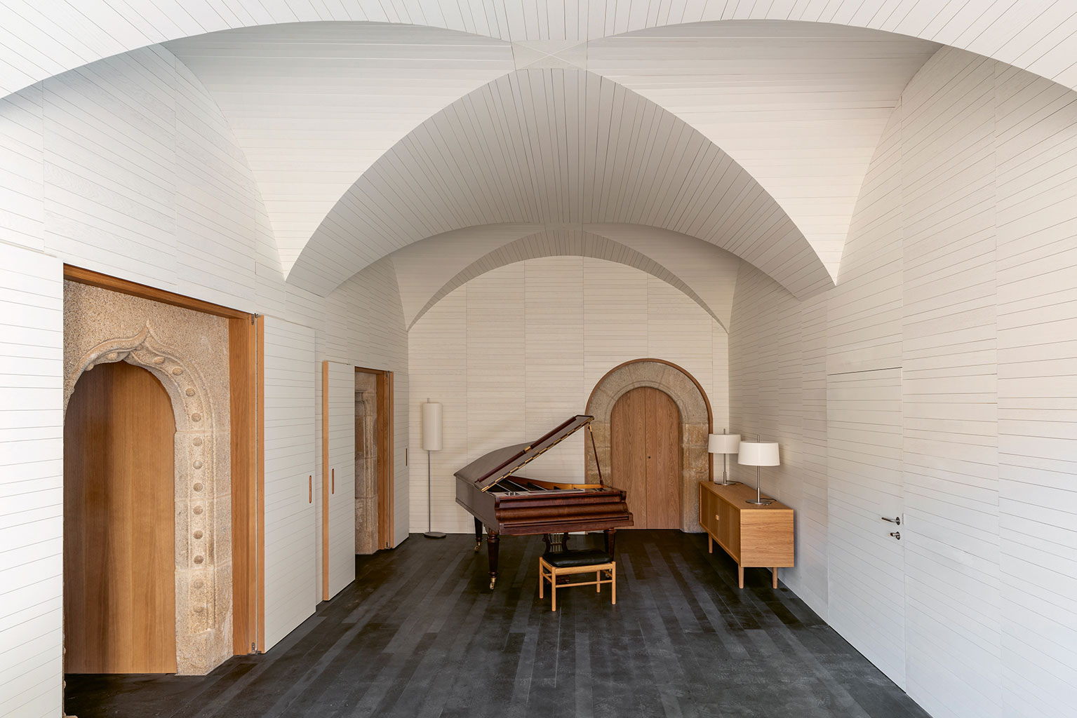La intervención está basada en el respeto a la estructura original del edificio histórico, con la incorporación de una arquitectura de carácter contemporáneo que, como si se tratara de una vestimenta interior, va cubriendo las superficies existentes mediante bóvedas encamonadas de madera en la planta baja, y artesonados, también de madera, en las dos plantas superiores.