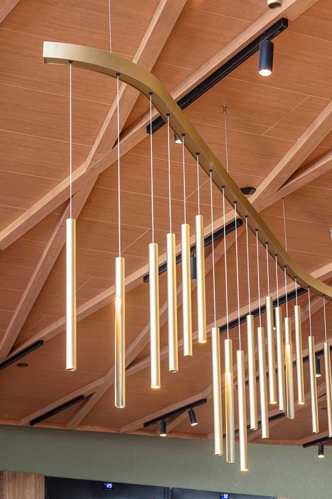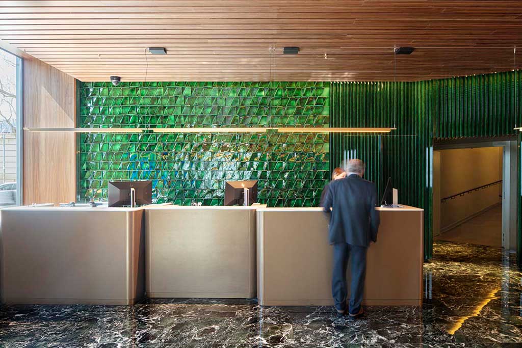 Los espacios están caracterizados por materiales de tonos cálidos en madera, una impresionante iluminación de latón en el bar y la recepción, así como suaves textiles en el restaurante. El elemento unificador del diseño es el color verde, que lo encontramos en los brillantes azulejos de cerámica del mostrador, en la pared trasera de la recepción y en las cortinas.