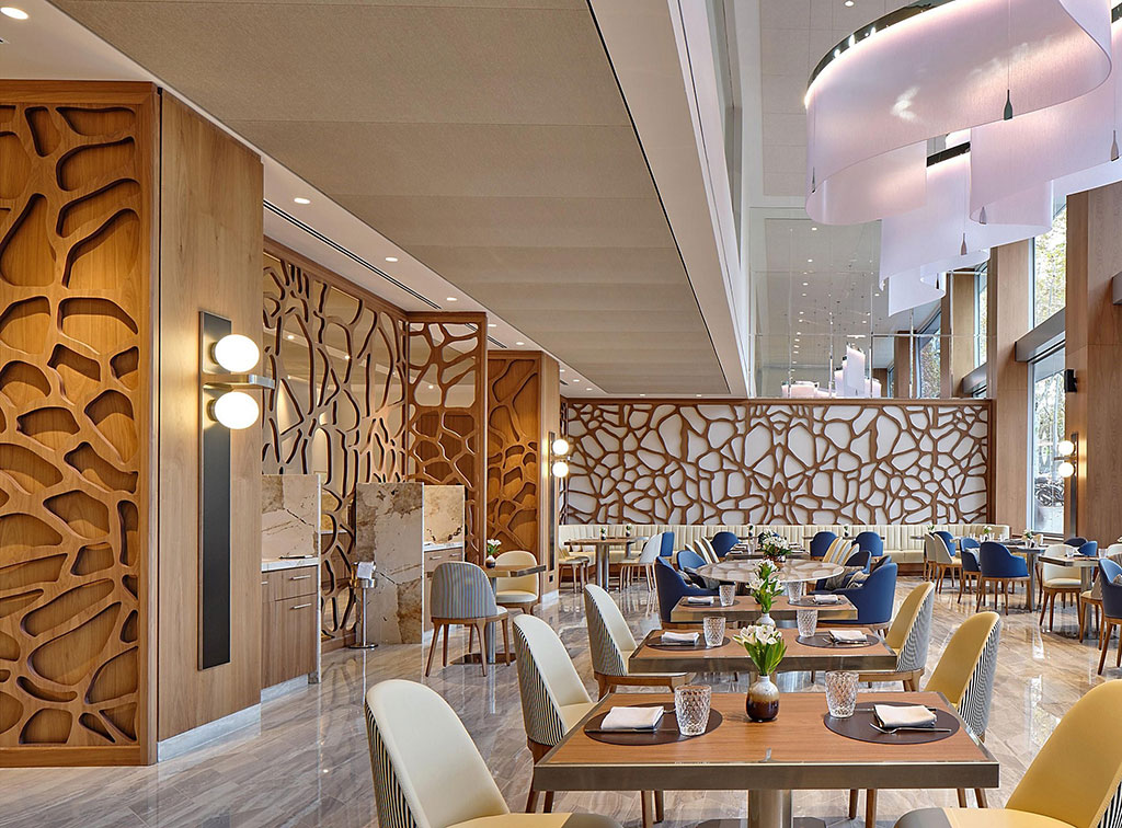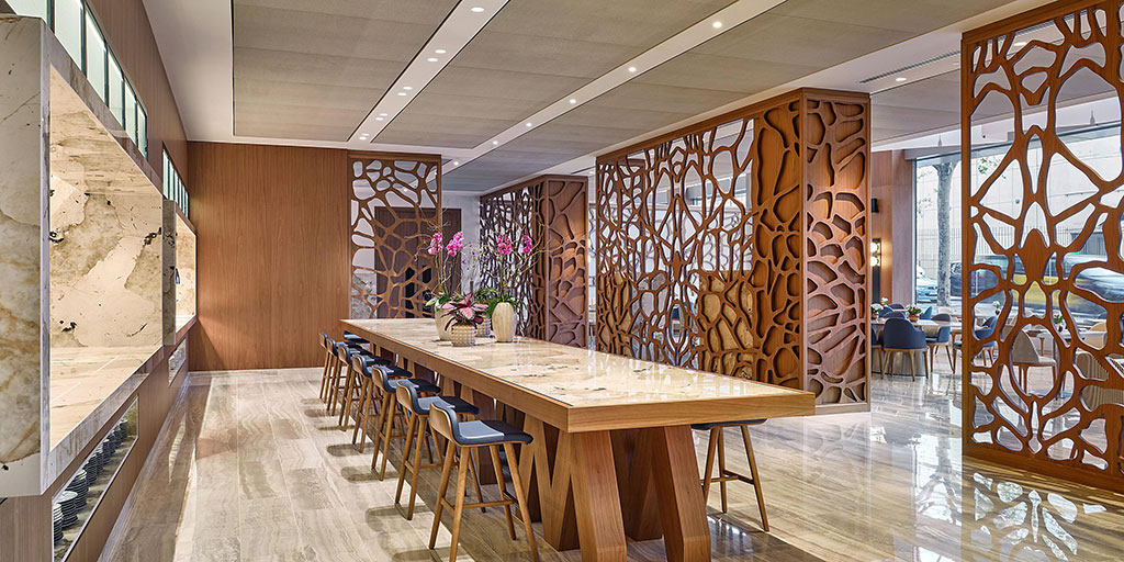 Cada mueble, cada lámpara, incluso las alfombras y las obras de arte, son piezas únicas y hechas a medida, componiendo un diseño atemporal con momentos de sorpresa. Ejemplo de ello son los mosaicos en los suelos, con patrones y líneas que recuerdan distintos elementos de la ciudad, y la utilización de muchos materiales nobles como maderas, mármoles o telas.