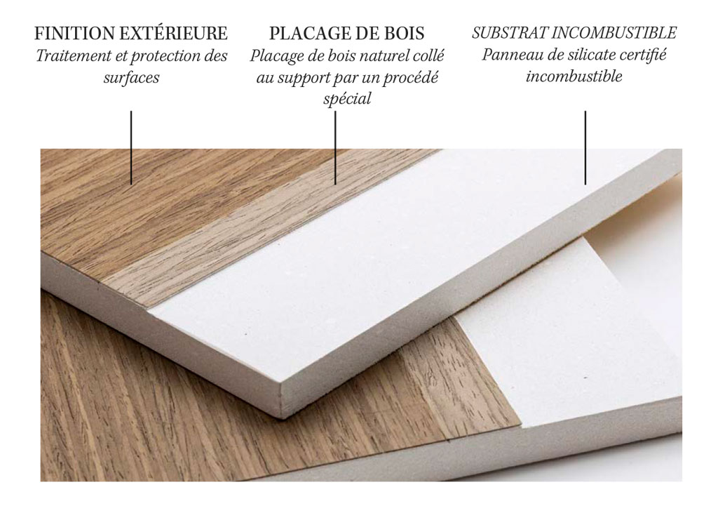 Le processus de fabrication se compose de plusieurs étapes dont la succession précise permet d’obtenir un résultat final à l’aspect naturel incomparable qui apporte de la chaleur et de la sophistication aux finitions. Toutes les étapes nécessaires sont réalisées dans des conditions contrôlées et garantissent la plus grande attention aux détails pour une finition parfaite, du collage du placage sur le support incombustible à la phase de préparation de la surface et au processus de vernissage final. Le toucher luxueux de ces surfaces n’est surpassé que par la beauté inégalée des nuances que seul le placage naturel peut conférer à un espace intérieur de haut de gamme.